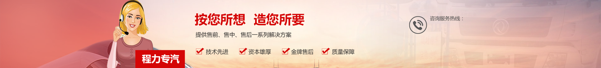 程力專用汽車股份有限公司銷售二十七分公司是定點(diǎn)生產(chǎn)各類專用汽車的專業(yè)廠家,大型專用汽車制造廠。國內(nèi)園林綠化、石油化工、市政環(huán)衛(wèi)、壓力容器專用汽車制造商。注冊(cè)商標(biāo)“程力威”牌,國家產(chǎn)品代碼:“CLW”。東風(fēng)、解放公司的重要合作伙伴,主要從事各類專用汽車的生產(chǎn)制造業(yè)務(wù),同時(shí)也銷售各大型廠家的整車及配件。公司擁有自行出口權(quán),產(chǎn)品占據(jù)大量國外市場,其主導(dǎo)品種有灑水車、油罐車、垃圾車、吸糞車、吸污車、自卸車、廂式貨車、半掛車、清障車、隨車吊、高空作業(yè)車、教練車、散裝水泥車、化工車、消防車、汽車配件、水泥攪拌車、牽引車等八大系列100多個(gè)品種車型。同時(shí)批發(fā)東風(fēng)、解放、楚風(fēng)各種二類底盤。